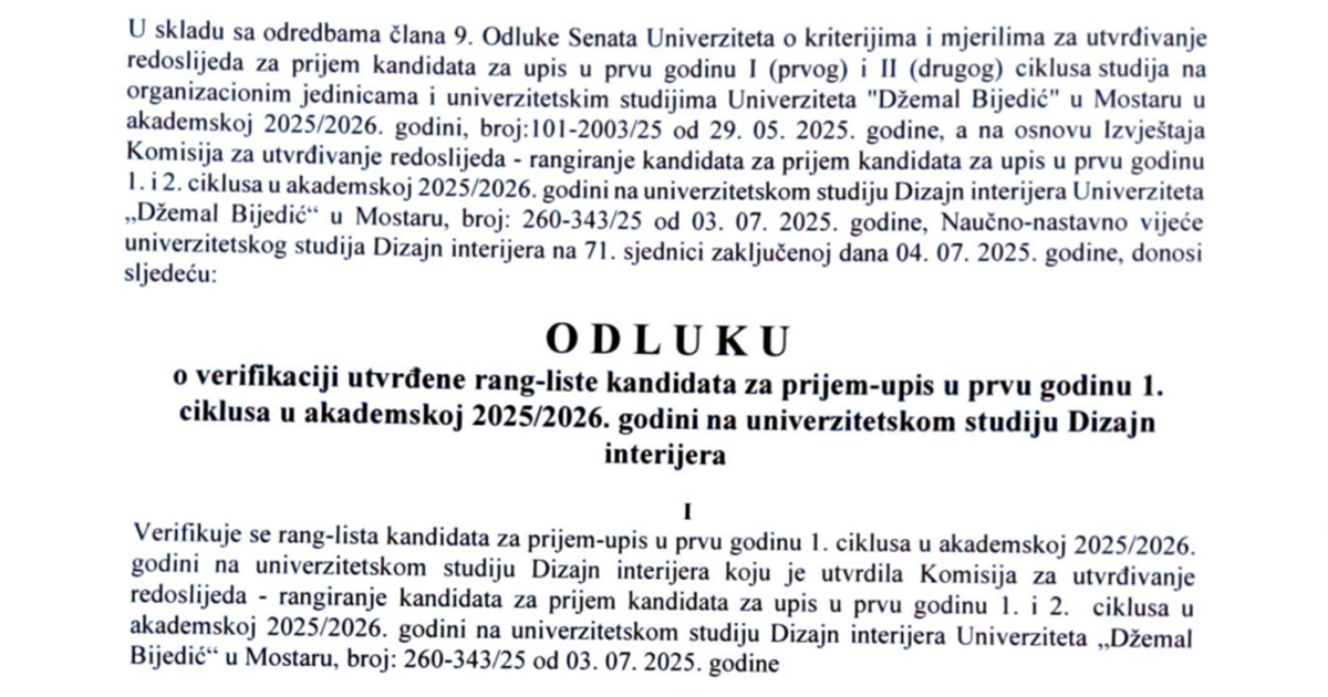Odluka o verifikaciji utvrđene rang-liste kandidata za prijem u prvu godinu 1. ciklusa u akademskoj 2025//26. godini na univerzitetskom studiju Dizajn interijera