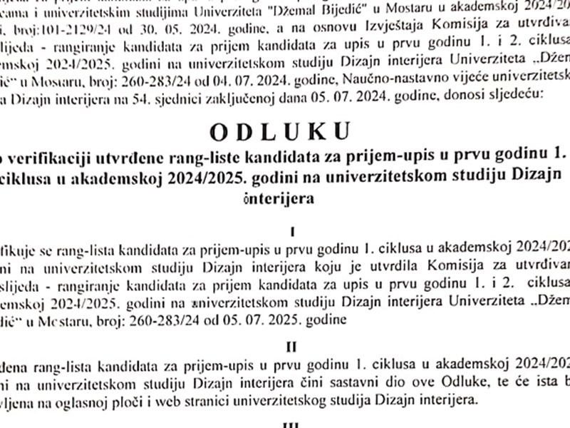 U prilogu se nalazi Odluka o verifikaciji utvrđene rang-liste kandidata za prijem/upis u prvu godinu I ciklusa Univerzitetskog studija Dizajn interijera u akademskoj 2024/2025. godini.