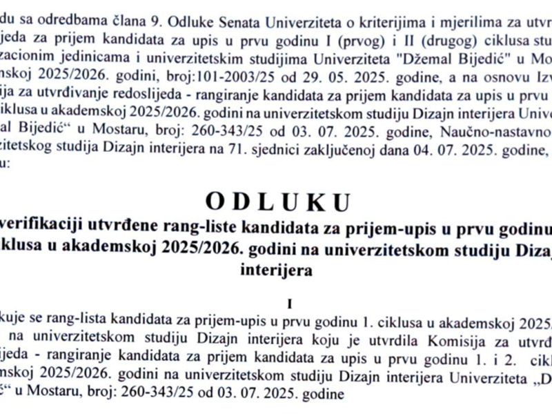 Odluka o verifikaciji utvrđene rang-liste kandidata za prijem u prvu godinu 1. ciklusa u akademskoj 2025//26. godini na univerzitetskom studiju Dizajn interijera