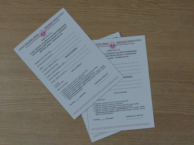 - uplatnica od 800 KM, svrha doznake: D1203 - uplata prve rate za Studij Dizajn interijera - akademska 2025/26. godina, žiro-račun broj: 1610200000290613, primalac: Univerzitet "Džemal Bijedić" - Nastavnički fakultet;